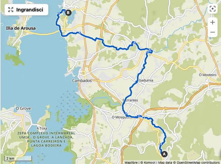 Santiago Tappa 3 Santiago Tappa 3: Armenteira-Vilanova de Arousa Difficile 06:26 24,1 km 3,8 km/h 170 m 430 m Sentiero escursionistico: <100 m Sentiero: 6,20 km Marciapiede: 2 Km Strada secondaria: 4,93 km Strada: 3,68 km Fuori rete (sconosciuto): 390 m