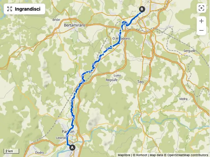 Santiago Tappa 4 Santiago Tappa 4: Puentecesures - Santiago de Compostela Difficile 07:37 28,5 km 3,7 km/h 4400 m 190 m Sentiero escursionistico: 215 m Sentiero: 5,50 km Marciapiede: 754 m Strada secondaria: 10,1 km Strada: 9,81 km Fuori rete (sconosciuto): 2,12 km