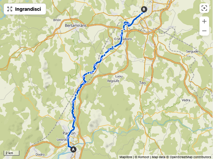 Santiago Tappa 4 Santiago Tappa 4: Puentecesures - Santiago de Compostela Difficile 07:37 28,5 km 3,7 km/h 4400 m 190 m Sentiero escursionistico: 215 m Sentiero: 5,50 km Marciapiede: 754 m Strada secondaria: 10,1 km Strada: 9,81 km Fuori rete (sconosciuto): 2,12 km